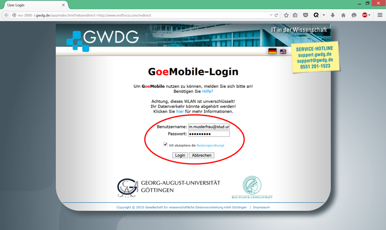 Öffne nun einen Browser oder ein neues Fenster im Browser. Es öffnet sich das Webportal zur Anmeldung. Hier meldest Du Dich mit Deinem Benutzernamen - der studentischen E-Mailadresse - und dem Passwort Deines Accounts an. Die Nutzungsbedingungen akzeptierst Du, indem Du den Haken setzt. Nach dem Klick auf den Button Login kannst Du nun das Internet nutzen. Allerdings ist die Verbindung unverschlüsselt.